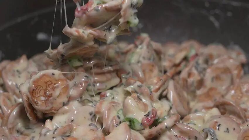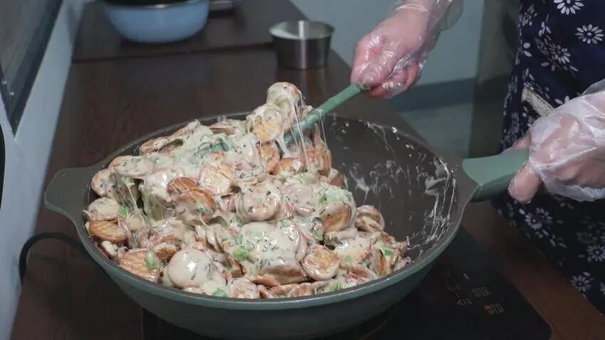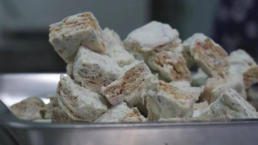 想要达到拉丝的效果 必须精准控制充气与锁气的程度 这样做出来的茶香酥 表面金黄酥脆 内部松软绵密 看赵师傅拉出的“千丝万缕” 宛如小编接二连三的口水