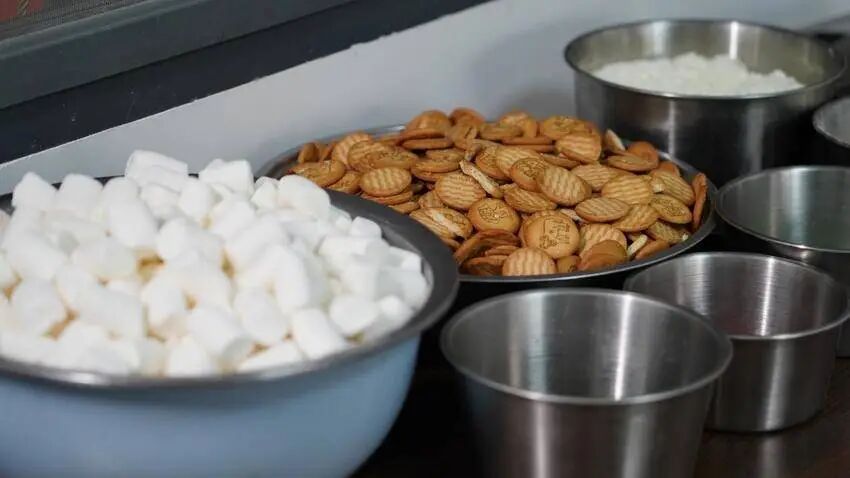 好了好了 咱们把注意力收回来 茶香酥其他演员也就位了 “宝藏配料”闪亮登场 火速倒入酥脆饼干、枸杞、 猕猴桃果干、奶粉 大力翻拌,嘿咻嘿咻