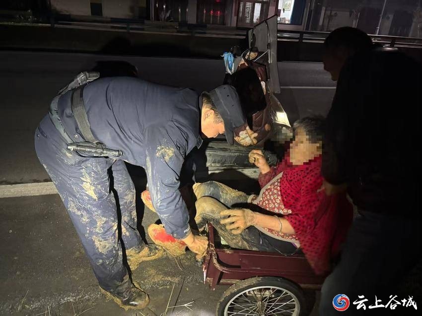 10月25日晚8时11分,谷城县公安局石花派出所接到群众紧急报警。报警人老赵称,自己76岁高龄的母亲晚上出门割叶子后一直未归,家人十分焦急。 接警后,值班民警陈杭迅速行动,驱车赶往老赵家中。到达现场后,陈杭详细询问了老人的穿着打扮、割叶子的具体区域以及可能骑行方向等关键信息。“晚上视线不好,老人应该不会走太远。”掌握线索后,陈杭根据自己的推测,立即驾驶警车在周边区域展开仔细搜寻。 车巡过程中,陈杭凭借敏锐观察力和丰富经验,发现一辆停放在田边不太显眼的三轮车,确认正是老赵母亲平时使用的。他快步走向田边,仔细寻找后,果然在田边水渠内发现了老赵母亲的身影,此时,老人因为意外跌落,身上满是泥水。 陈杭立即通知家属和120急救人员到场,并毫不犹豫地跳入水渠,确认老人身上无明显外伤后,小心翼翼将其从水中捞起,并迅速转移到安全地带。