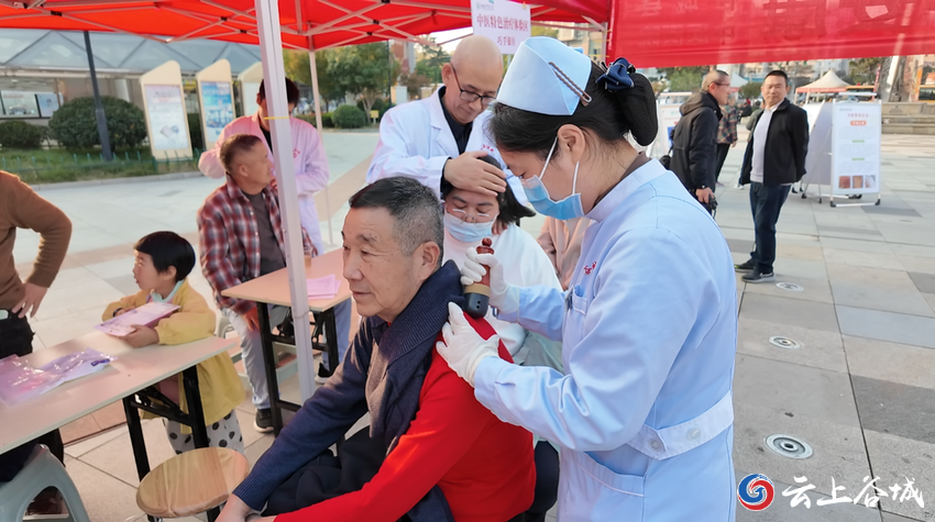活动现场,中医特色治疗体验区人气十足,推拿、艾灸、耳穴压豆、巧手银针等特色项目前不时排起队伍。医护人员一边操作一边讲解,耐心传授养生技巧。