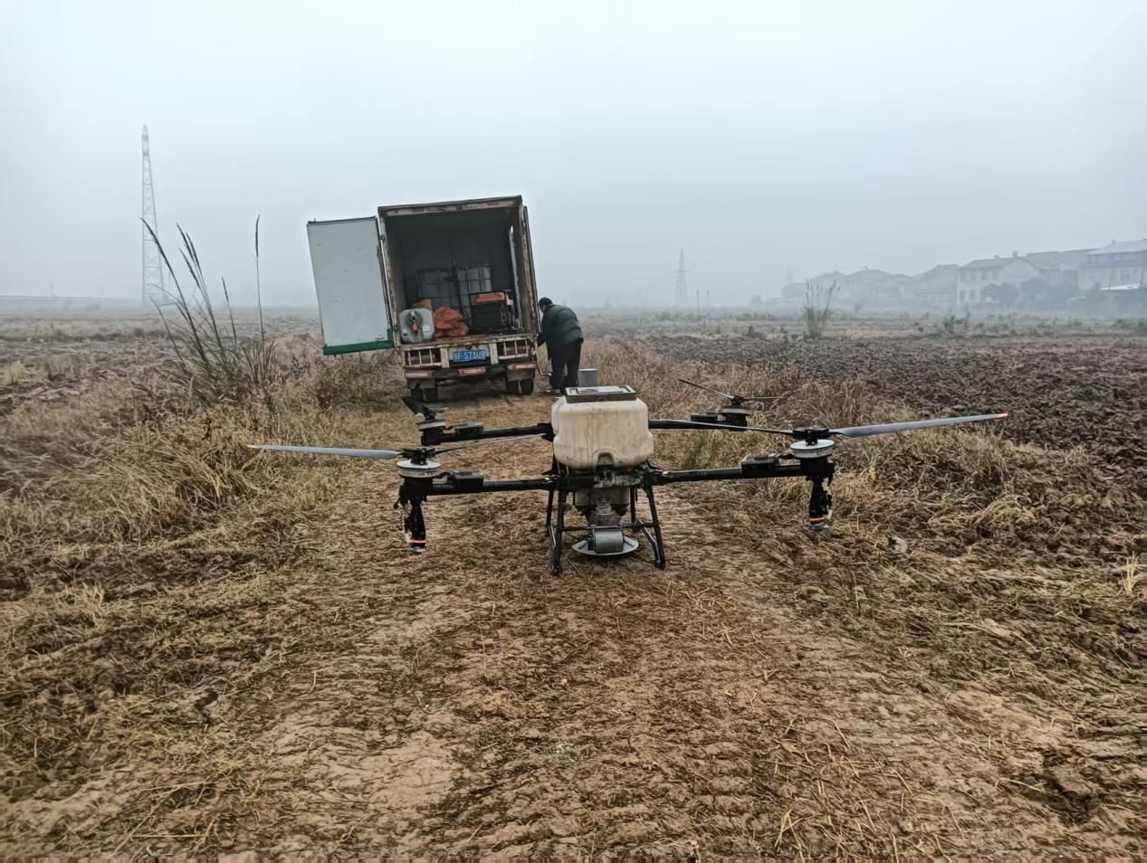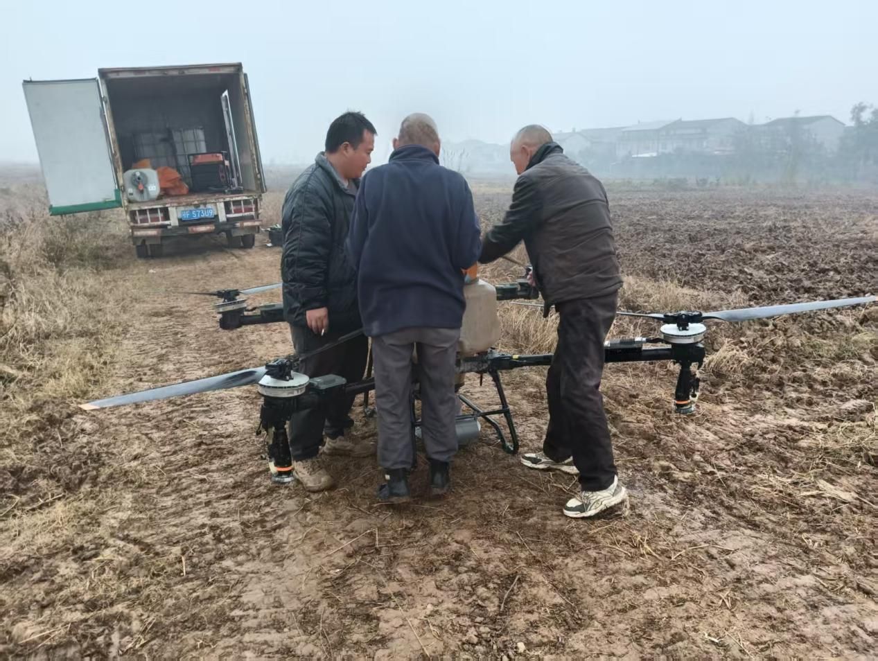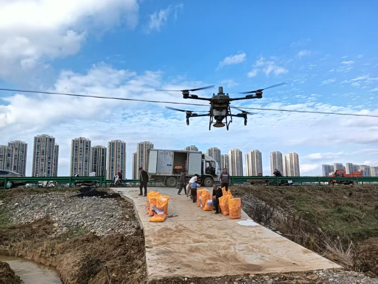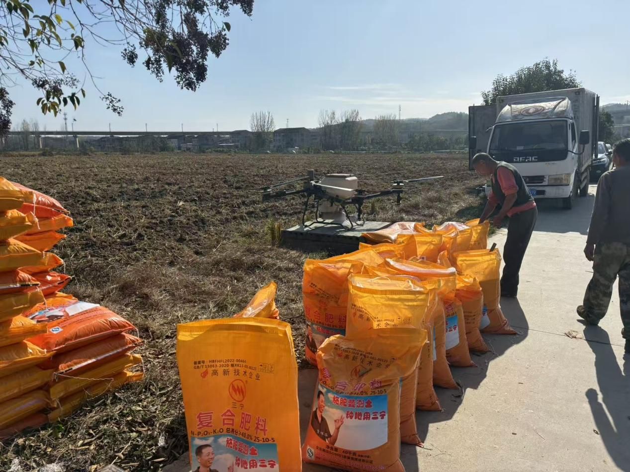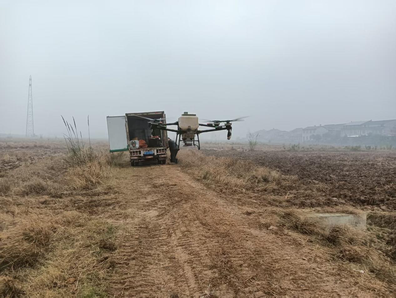 近日,在谷城县城关镇朱家洲村连片的承包田内,和天下家庭农场公司和村干部协同操作无人机,开展小麦和油菜播种作业。