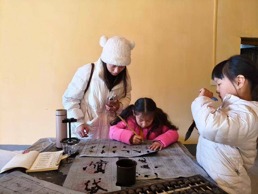 笔者在现场看到,师生及文化爱好者们分组参与年俗实践:书法文化室,学生在宣纸上挥毫泼墨,书写春联;民俗体验区,传统算盘操作与年猪仪式生动还原传统年节场景;后勤保障组,文旅推荐官穿梭于青石板巷,为古宅门楣贴上红火祝福。