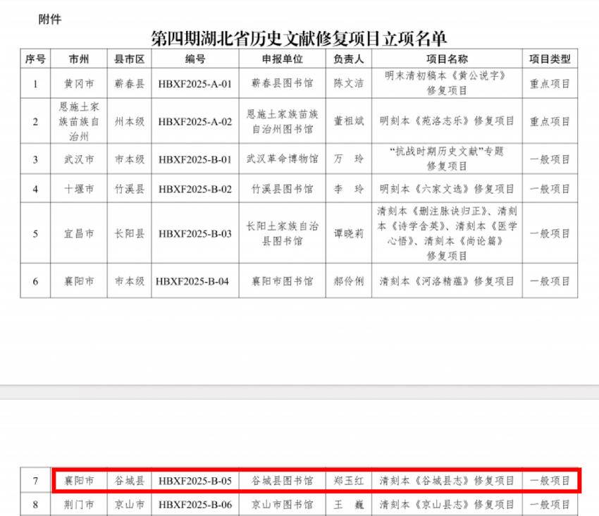 近日,湖北省文旅厅公布第四期历史文献修复项目立项名单,由谷城县图书馆申报的“清刻本《谷城县志》修复项目”成功入选。这是该项目继2022年后第二次获得省级立项支持。