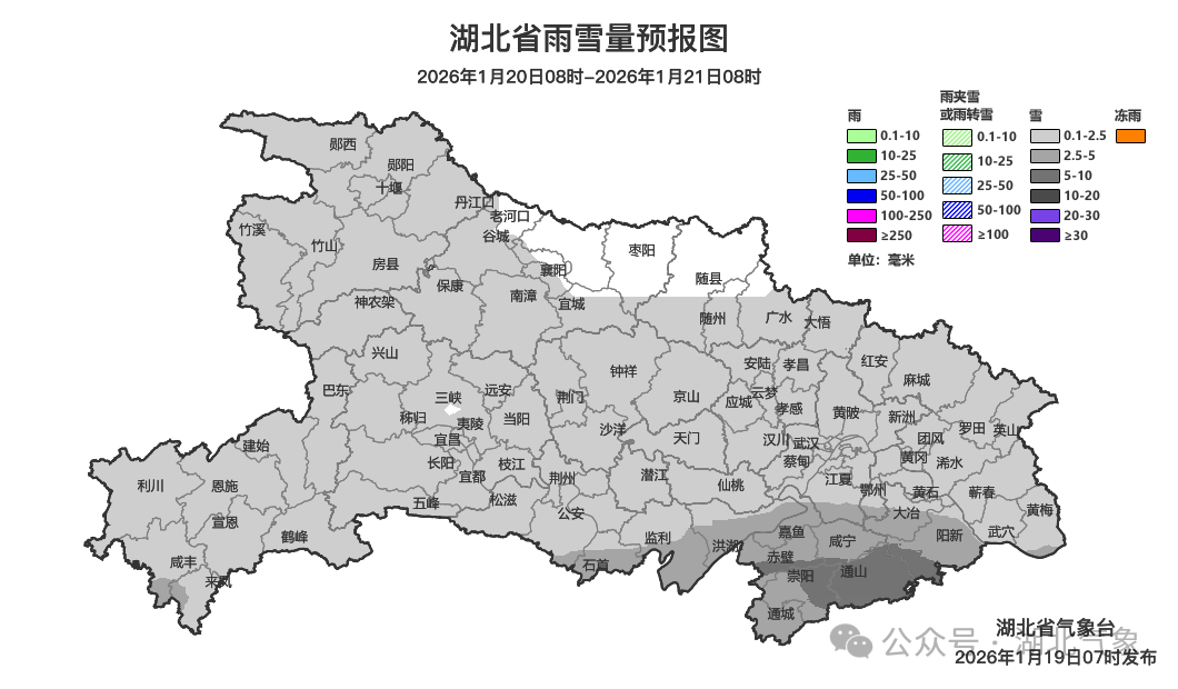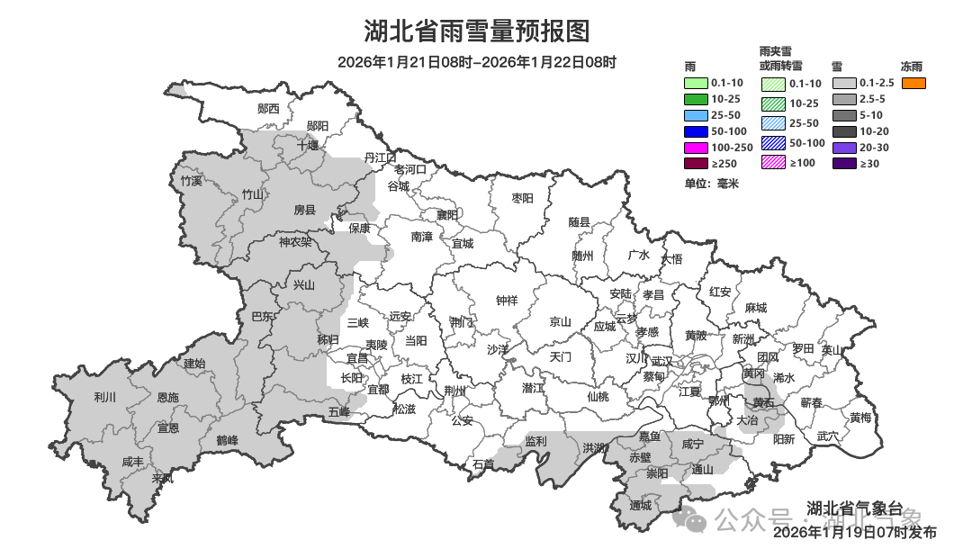 十堰多地出现冰粒或雪 天气预报 1月20日8时-21日8时,江汉平原东部、鄂东南阴天有小到中雪,局地大雪;其他地区阴天有小雪。最高气温恩施地区1~3℃、其他地区-2~1℃,最低气温恩施地区-2~1℃、其他地区-6~-2℃,偏北风3到4级、阵风5到7级。