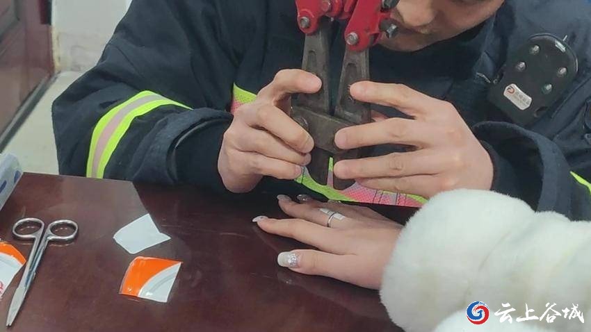 1月30日11时40分,一名女子急匆匆来到谷城消防救援局园林路消防救援站求助,其无名指被戒指紧紧卡住,因自行尝试摘取许久无果,手指已出现轻微肿胀,担心造成进一步伤害,遂向消防人员求助。