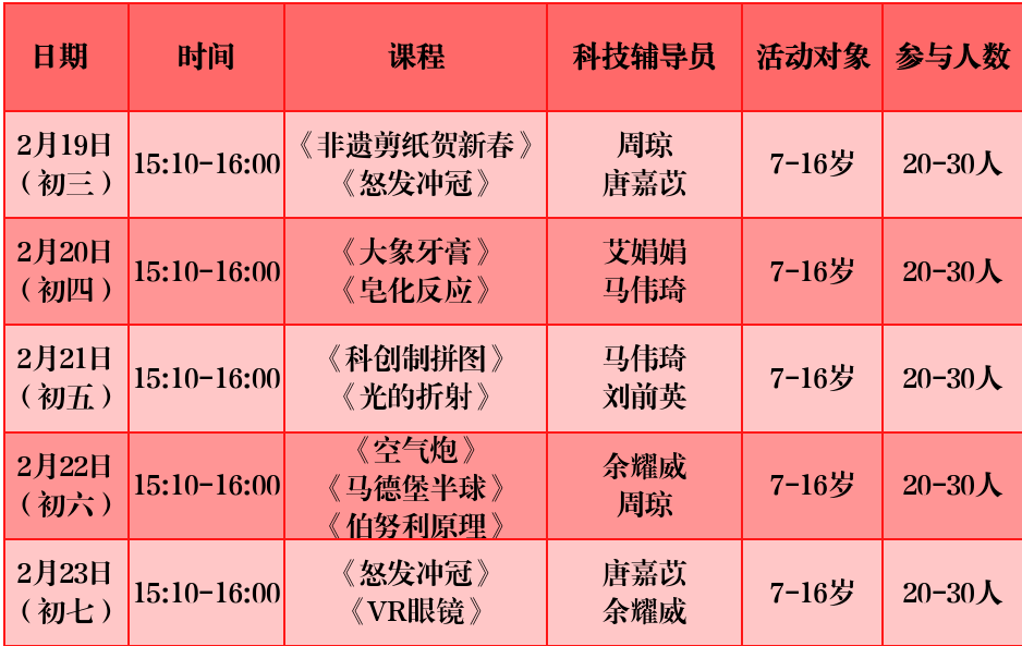 这个春节,年味里加点“科技感”! 谷城县科技馆2026年新春活动全面升级, 五大精彩玩法带你玩转科学、惊喜不断! 无论是亲子互动、趣味实验, 还是打卡探秘,这里统统都有~ 快来一起解锁吧! 01 玩法一:科学实验课·天天不重样 时间:初三至初七(2月19日—2月23日) 每天不同主题,科学老师带你动手玩实验!
