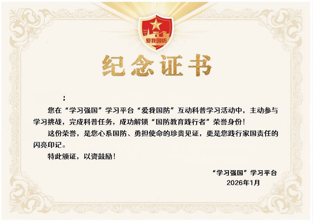 还在惊叹“梦想号”的深蓝征途? 还在想象“歼-35A”划破长空的英姿? 还在琢磨“侦察接收机”如何织就无形天网? 这不只是知识 这是一场属于你的“入列考核”! “学习强国”学习平台正式向你发出邀请: “爱我国防”互动科普问答现已上线 它不仅是一次答题 更是一次“身份认证” 这是一场什么样的试炼? 从大国重器到尖端科技 题目就是你的“侦察接收机” 带你穿透迷雾,掌握核心 告别枯燥说教 在互动中亲历决策与挑战 使命感和成就感直接拉满 成功通过全部挑战 你将不再是旁观者 “学习强国”学习平台将为你颁发 专属 【国防教育践行者】电子纪念证书 这不仅是学习证明 更是一枚值得收藏的“国家级”精神徽章 是你关心国防、投身建设的荣耀印记 参与方式 即刻进入:打开抖音APP,扫描下方二维码,进入答题专区。 完成挑战:全面通关,展示你的知识“战力值”。 领取认证:系统将自动生成你的专属电子证书。