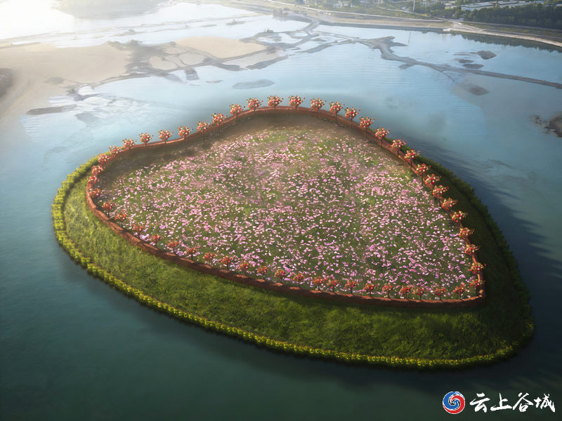 据悉,为了打造“河畅、水清、岸绿、景美、人和”的生态新格局,谷城县启动南河城区段河滩环境整治及生态修复工程,这座爱心小岛就是工程里的“颜值担当”,总面积达24800平方米。