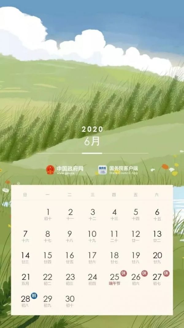 各省、自治区、直辖市人民政府,国务院各部委、各直属机构: 经国务院批准,现将2020年元旦、春节、清明节、劳动节、端午节、国庆节和中秋节放假调休日期的具体安排通知如下。 一、元旦:2020年1月1日放假,共1天。 二、春节:1月24日至30日放假调休,共7天。1月19日(星期日)、2月1日(星期六)上班。 三、清明节:4月4日至6日放假调休,共3天。 四、劳动节:5月1日至5日放假调休,共5天。4月26日(星期日)、5月9日(星期六)上班。 五、端午节:6月25日至27日放假调休,共3天。6月28日(星期日)上班。 六、国庆节、中秋节:10月1日至8日放假调休,共8天。9月27日(星期日)、10月10日(星期六)上班。 节假日期间,各地区、各部门要妥善安排好值班和安全、保卫等工作,遇有重大突发事件,要按规定及时报告并妥善处置,确保人民群众祥和平安度过节日假期。 国务院办公厅 2019年11月21日