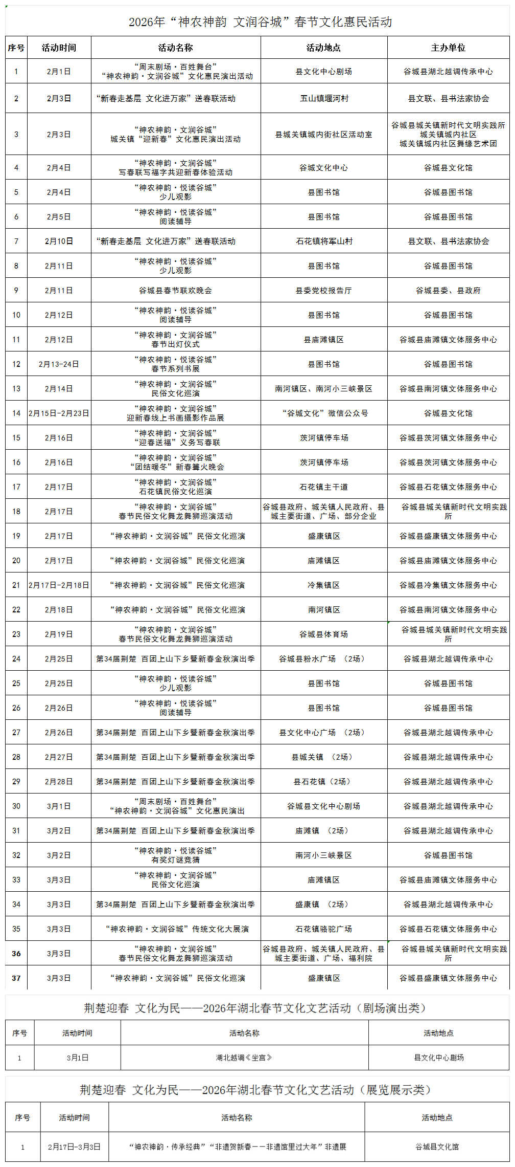 速收藏!2026年“神农神韵·文润谷城”文化惠民活动预告 发布日期: 2026-02-02 字体:【大 中 小】 金蛇舞罢丰收岁,骏马奔腾锦绣春。亲爱的谷城朋友们,马年新春将至,59场充满魅力的文化盛宴将在谷城盛大开启!丰富多彩的文化活动,让您在浓浓的年味中感受传统文化魅力。以下是活动的精彩预告: 来源:谷城县文化和旅游局 编辑:邓植元|审核:陈声权 琚晓青 作者:云上谷城 【关闭本页】 【打印本页】