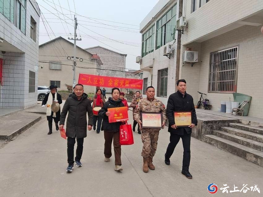 锣鼓传喜,荣耀到家!日前,谷城县退役军人事务局与石花镇政府组成慰问组,带着沉甸甸的荣誉与关怀,先后走进石花镇蔡家营村、凉水井村,为荣立个人三等功的现役军人李春、龚磊家庭送上立功喜报与奖励金,让“一人立功、全家光荣”的自豪感在冬日里暖心传递。