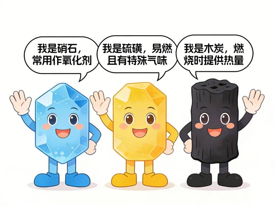 关键配方解析: 硝石(硝酸钾):供氧核心,燃烧时释放大量氧气,助燃增效。 硫磺:黏合剂与可燃物,降低火药燃点,稳定燃烧。 木炭:燃料主体,产生气体与热量,推动爆炸反应。 科学点睛:三者的结合,实现了“自供氧燃烧”,无需空气即可剧烈反应,这正是火药区别于普通燃烧的化学密码。