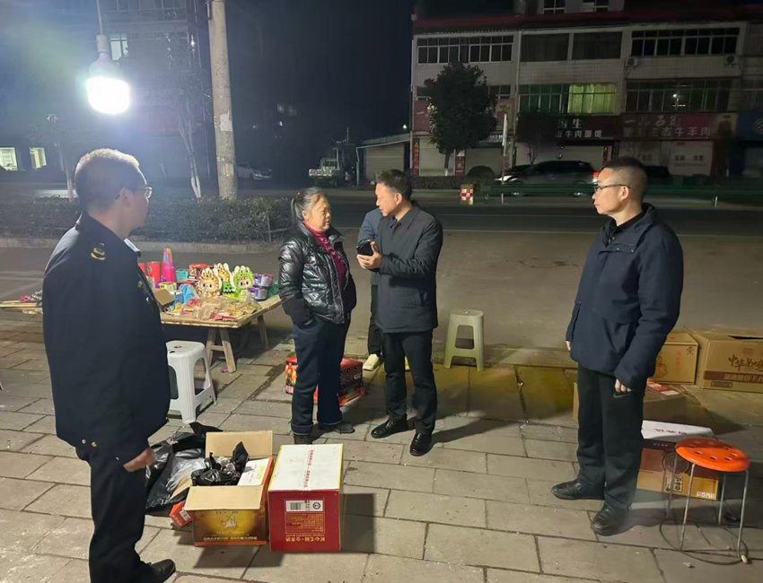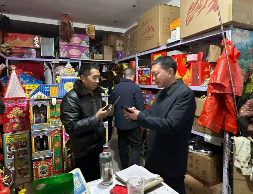 为迅速贯彻落实全县烟花爆竹安全管理紧急调度会议精神,2月18日晚,谷城县庙滩镇党委书记刘俊带队,组织镇机关干部、市场监管所、派出所等执法人员,对辖区内烟花爆竹零售点开展安全检查与宣传,以最严措施筑牢节日安全防线。