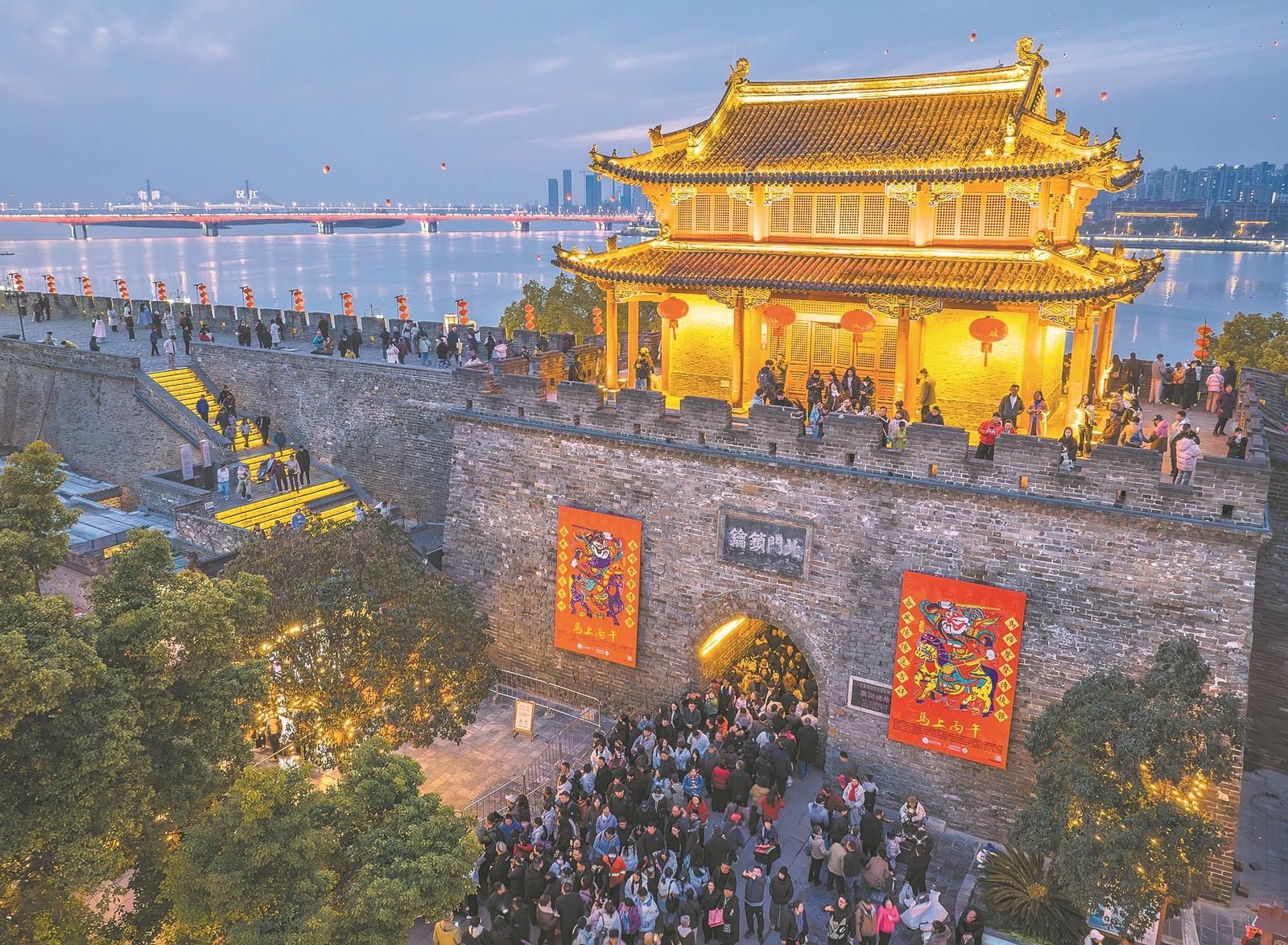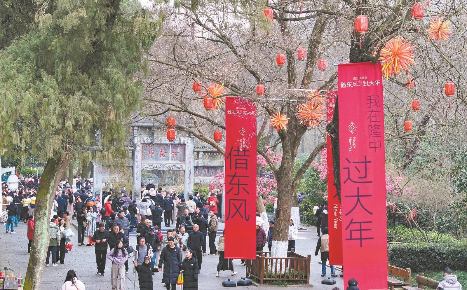 2月19日,市民和游客在保康县马桥镇尧治河村观看民俗表演。 陈泉霖 王晓丹 向鑫 摄 古城文脉焕新彩 三国雅韵迎新春 春节假期,襄阳古城游人如织。登昭明台听晨钟暮鼓,逛北街感受市井烟火,在古城墙上远眺山河壮阔,遥想金戈铁马……游客循着历史文脉,在襄阳开启了一段文化之旅。 清晨敲钟,日暮击鼓,昭明台复刻出晨钟暮鼓这一历史名场面。伴随着一次次有力的敲击,青铜大钟声音浑厚悠远,九响钟鸣暗合长长久久的美好愿景。游客登上昭明台,参与撞钟击鼓的体验活动,在悠扬的钟声与铿锵的鼓韵中祈福纳祥,感受襄阳古城的厚重历史与浓郁的新春年味。 古隆中景区推出“遇见诸葛亮·借东风过大年”沉浸式三国主题活动,吸引各地游客纷至沓来。三国英雄巡游、《三顾茅庐》实景情景剧,为游客呈上一场精彩绝伦的文化盛宴。 NPC互动更是受到游客追捧。崔州平守牌坊、大乔小乔驻国风营地、孙权关羽立三顾堂广场……游客与三国NPC互动,在沉浸式游园闯关中,感受三国文化。春节假期,古隆中景区累计接待游客超13万人次,单日最高接待游客超3万人次。