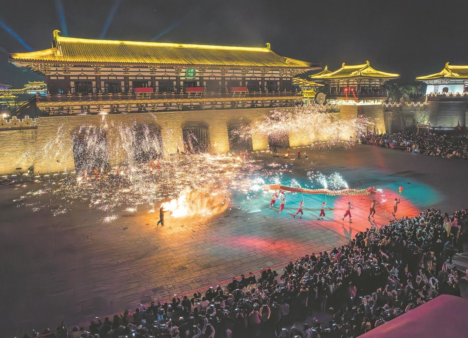 春节假期,古隆中景区推出“遇见诸葛亮·借东风过大年”等活动。 王虎 摄 光影盛宴耀佳节 唐风国潮引客来 春节假期,襄阳华侨城奇幻度假区奇幻谷以科技赋能,打造的“奇梦城堡光影秀”点亮假日夜空。7D光影投影技术融合襄阳古城、诸葛孔明、郭靖射雕等元素,与璀璨烟花交相辉映,为游客献上震撼人心的视听盛宴。 主题巡游、水下舞狮、非遗迎客鼓、奇幻灯会等活动轮番上演,喜庆热烈。与央视春晚同款造型的机器人灵动起舞,以精湛表演赢得阵阵喝彩。“景区+酒店”一站式度假模式,为亲子家庭提供便捷、舒适的游玩体验。这个春节假期,襄阳华侨城奇幻度假区游客接待量较去年同期提升169%。 唐城景区的巨型鳌鱼出圈又出彩。鳌鱼,中国神话传说中记载的一种神兽,身似鱼,头似龙,身巨大。唐城景区的这只巨型鳌鱼,蓝色眼眸炯炯有神,颌下白须随风轻扬,鳍翼灵活舒展。随着表演者的牵引,鳌鱼恰似在天际间遨游。景区精心准备的“大唐文化复原剧目展演”,让一幅幅名画“活”起来。从《裙幄宴》《步辇图》《捣练图》中汲取灵感……在演员们的精心演绎下,古人宴饮的闲适与雅致、捣练缝衣的温馨日常跃入眼帘。春节假期,唐城景区接待游客23万人次。