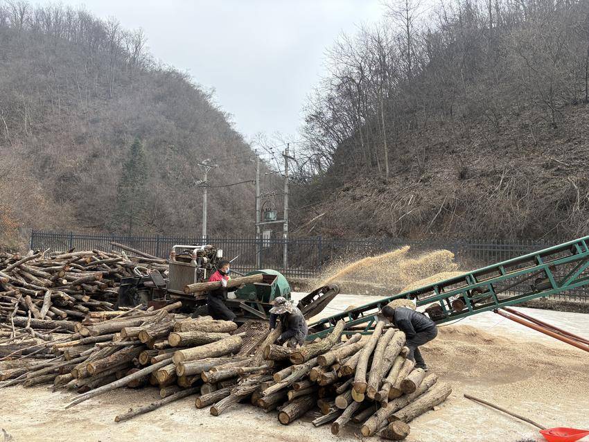 机声隆隆生产旺。在左家庙村食用菌生产基地,机器轰鸣声此起彼伏,工人们将原木送入粉碎机,一根根原木瞬间化作细腻木屑,经传送带堆积成一座座金黄色的“木屑山”——这正是制作菌棒的基础原料。