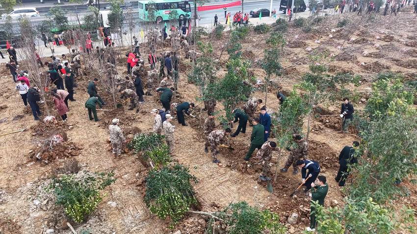 在谷城高速路口,参加植树的人员热情高涨、干劲十足,即将踏入军营的“准新兵”与刚刚荣归故里的“老班长”们两人一组、三人一队,并肩挥锹、共植新绿,用汗水浇灌双拥之情,以行动赓续红色血脉。