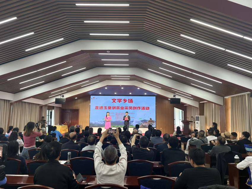 张总与作家们亲切互动,沿途介绍茶园的生态种植模式与发展故事,先后带领大家参观了茶坛、观海楼、云华轩、知青文化馆、茶坛酒店等特色景点。在知青文化馆,老知青当年的劳动工具、照片与日记,诉说着玉皇剑茶产业的发展变迁;在观海楼远眺,万亩茶园与青山绿水交相辉映,构成“茶在园中、园在景中”的优美画卷,让作家们沉浸式感受茶乡风光与人文底蕴。 中午,作家们在玉皇剑养生山庄就餐,餐桌上摆满了地道农家菜,新鲜的山间野菜、本土特色佳肴,口感淳朴、鲜香可口,既还原了乡村烟火气,也让作家们在味蕾上感受茶乡的独特魅力,大家边吃边聊,在欢声笑语中增进交流、凝聚情谊。 下午,本次采风活动的重头戏——节目汇演在玉皇剑总部研学楼四楼大会议室温情上演,为这场文茶之约增添了别样韵味。节目形式丰富多样,现场氛围热烈融洽:歌曲《好运来》旋律欢快,一开口便点燃了现场气氛,传递出满满的喜悦与美好期许。歌舞《茶山情歌》将茶乡风情与歌舞之美相融,舞姿轻盈、歌声悠扬,生动展现了茶山儿女的热情与浪漫。玉皇剑茶艺表演行云流水,茶艺师手法娴熟,举手投足间尽显茶道雅致,让现场观众沉浸式感受中华茶文化的博大精深。多首诗朗诵作品轮番上演,朗诵者情感真挚、语调铿锵,将对玉皇剑茶山、茶叶的热爱与赞美娓娓道来,引发在场作家们的强烈共鸣。整场汇演节奏明快、氛围浓厚,每一个节目都赢得了现场阵阵掌声,为采风活动增添了浓厚的文化气息。 “今天,各位作家走进茶山、贴近茶人,亲身感受我们的茶园风光、生产工艺和人文底蕴,这对我们来说是莫大的鼓励。恳请各位作家朋友们,能以你们的生花妙笔,捕捉茶乡的美好、讲述玉皇剑的故事,把我们的茶山之美、茶韵之深、茶人之诚传递出去,助力我们实现茶产业与文学艺术的深度融合,让玉皇剑的一片叶子,承载着茶乡文化,走向更广阔的天地。”玉皇剑茶业有限公司董事长张于学的讲话情真意切,既饱含对茶乡的热爱,也充满对文化赋能产业的期待,赢得了现场作家们的热烈掌声。