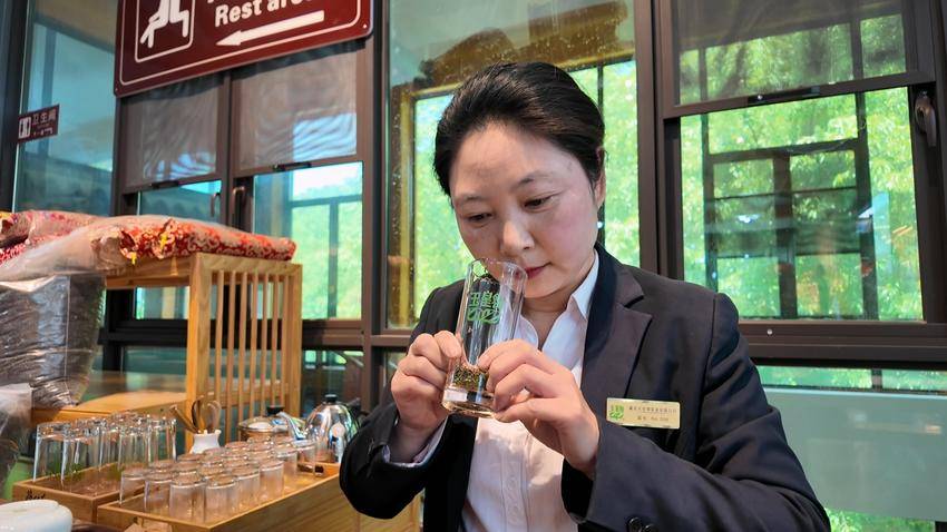 为确保赛事公平公正,评委团严格遵循“统一原料、统一器具、统一时间、统一标准”的原则,从茶叶外形、色泽、香气、汤色、滋味、叶底六大核心维度进行综合考量、细致评分。来自玉皇剑茶业的李娟炒制成型的茶叶条索匀整、色泽鲜亮,冲泡后茶汤清亮澄澈、栗香浓郁持久、滋味鲜醇回甘,凭借过硬品质赢得了评委们的一致青睐,最终获得大赛一等奖。