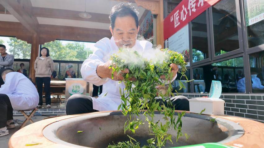 比赛中,选手们凝神聚力、专注投入,35口电炒锅整齐排列、热气升腾。鲜嫩的茶芽投入高温铁锅中,在选手们娴熟的指尖翻飞流转,抓、抖、搭、推、揉等传统制茶手法一气呵成,精准把控的火候、恰到好处的力度,将杀青、揉捻、做形、提香等全流程工序演绎得炉火纯青。