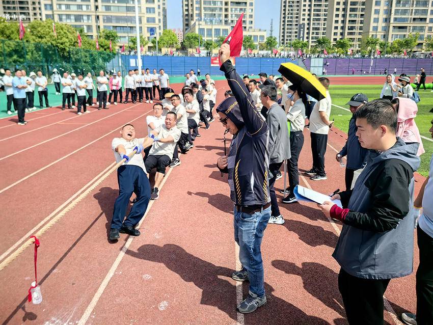 趣味赛场高潮迭起。拔河赛道上,麻绳紧绷、口号震天,队员们咬紧牙关、齐心协力,指挥与队员同频共振,每一次僵持与发力都牵动全场目光;50米混合迎面接力中,选手们奋力奔跑、默契交接,速度与激情碰撞;毛毛虫竞速、齐心协力、同心同步等项目里,队员们步调一致、配合默契,在协作中增进情谊,在比拼中凝聚力量。